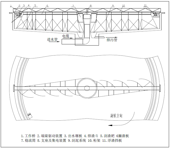 中心支座由固定支(zhī)撑座、回转轴承和桥架组(zǔ)成,可同时承受轴(zhóu)向力、径向力和倾覆力矩(jǔ)。集(jí)电装置采用滑环式集电装置,由集电环和电刷架组(zǔ)成。浮渣刮板、浮渣耙板、浮渣漏(lòu)斗组成排渣机构,能有效地清除水面浮渣。工作桥(qiáo)是连(lián)接中心支座和行(háng)走端梁的大型(xíng)部件,其上有走道板(bǎn)和栏杆,钢梁的下面连接刮泥结构、排(pái)渣机构等,在行走装(zhuāng)置(zhì)的带动下来完成刮泥、排渣工作。