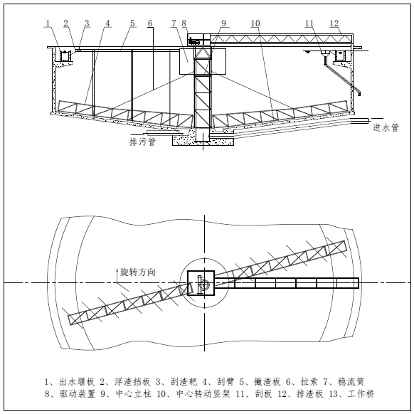该设备采(cǎi)用中心传动(dòng)、垂架式,污水(shuǐ)从进(jìn)水管流入导流筒扩散后,均匀的向周边呈辐射状流出,呈悬浮(fú)状的污泥经沉淀后沉(chén)积于池底,驱动装置带动中心竖架旋转,并带动刮臂及刮泥(ní)板转动,将污泥从池周刮向中心集泥槽后,靠池内静水压由排(pái)泥(ní)管排出池外。水面的浮渣通过撇渣装置撇向池边,再由刮渣耙(pá)刮进(jìn)排渣(zhā)斗内(nèi)排出池外。而上清液则通过出水堰板溢入出水槽内排出。